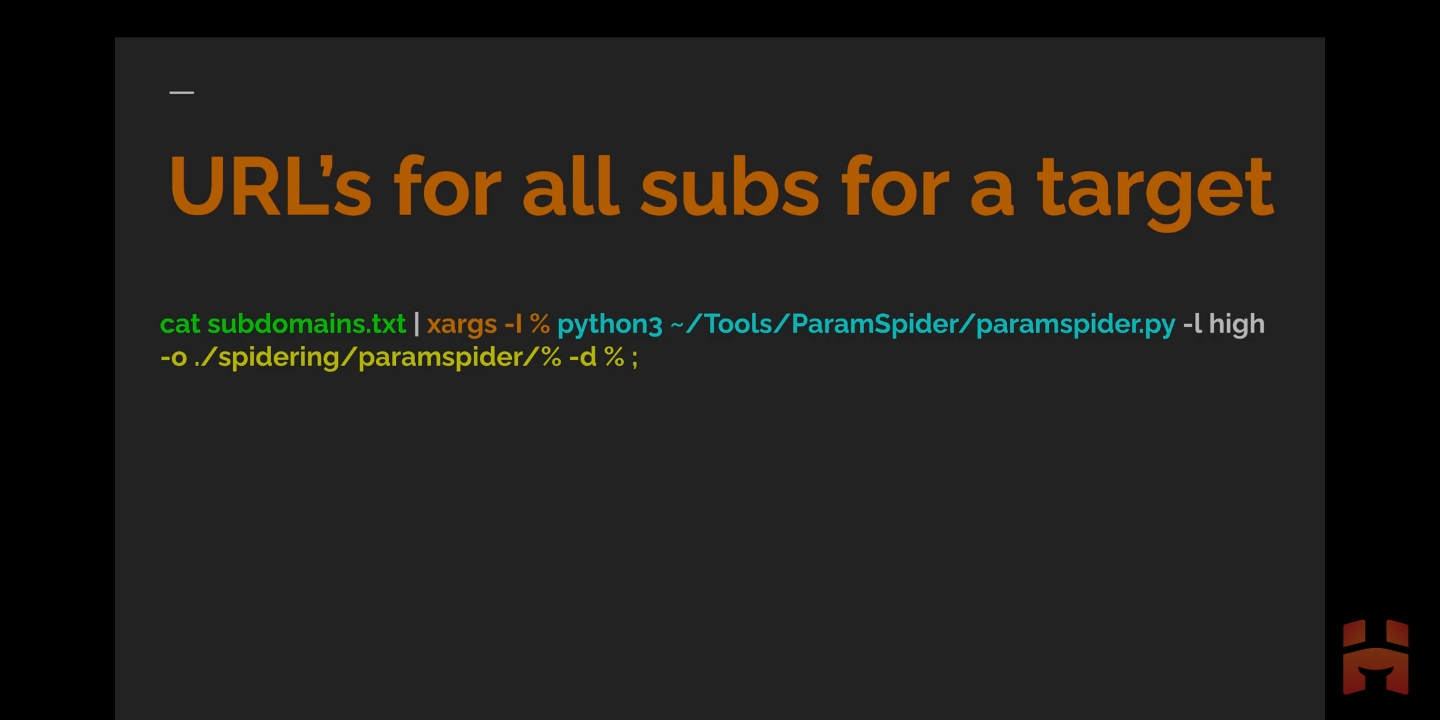 assetfinder example.com | gau | egrep -v '(.css|.png|.jpeg|.jpg|.svg|.gif|.wolf)' | while read url; do vars=$(curl -s $url | grep -Eo "var [a-zA-Z0-9]+" | sed -e 's,'var','"$url"?',g' -e 's/ //g' | grep -v '.js' | sed 's/.*/&=xss/g'); echo -e "\e[1;33m$url\n\e[1;32m$vars"; done