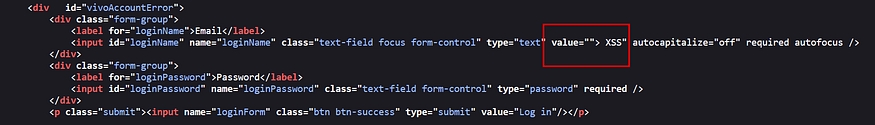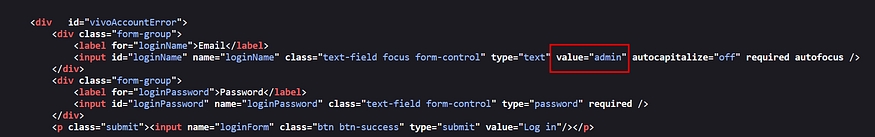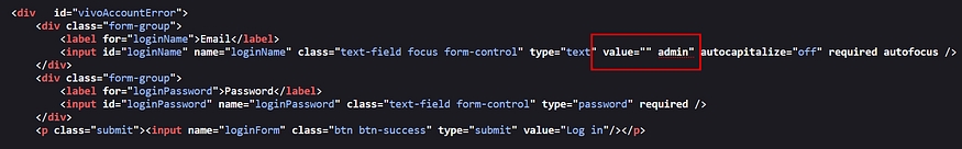 but nothing work, I decided to examine the source code and found of the username that I entered a little while ago printed inside the value attribute.